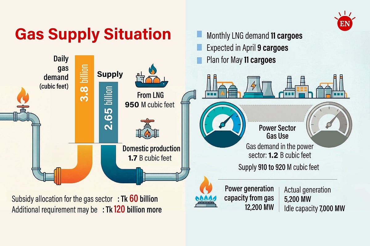 According to the Bangladesh Power Development Board (BPDB), ensuring load-shedding-free electricity during the summer (April–May) would require 1.2 billion cubic feet of gas per day. However, only about 910 million cubic feet was supplied yesterday, preventing power plants from operating at full capacity.