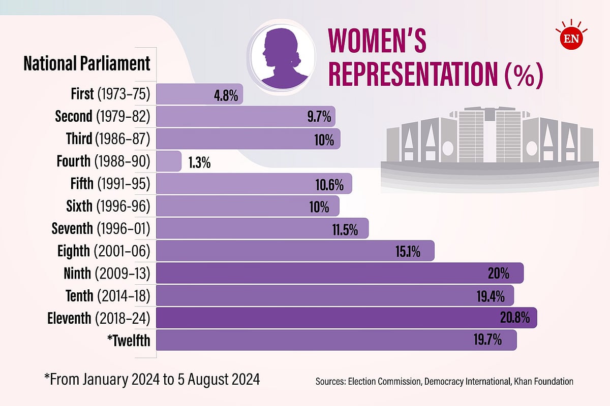 According to the Election Commission, the Khan Foundation’s research report “Empowering Women Through Reserved Seats in Parliament: Fight or Flight Response?”, various newsletters from Democracy International, and Prothom Alo’s own reports, women’s representation in Parliament began with the 15 reserved seat holders in the first National Parliament (1973–1975).