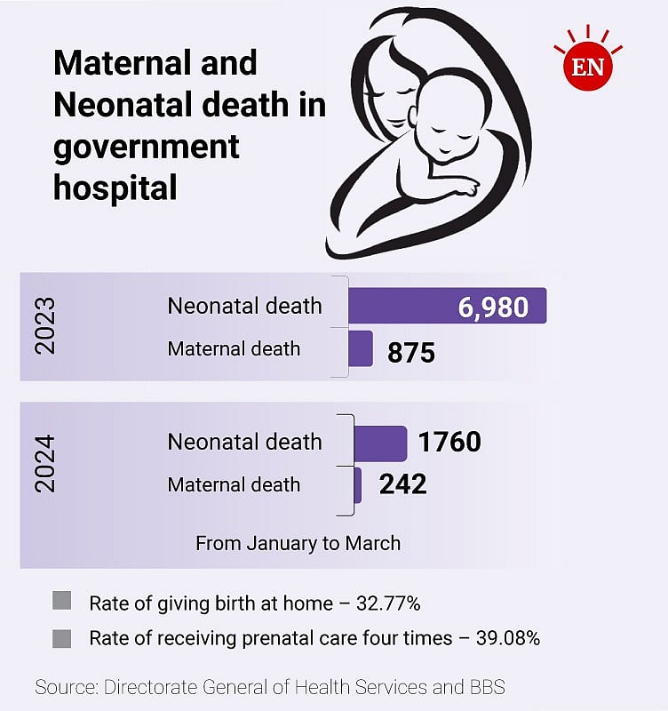 According to the Directorate General of Health Services (DGHS) data, there have been 1,760 neonatal and 242 maternal deaths in a total of 586 government hospitals including upazila health complex, medical college hospitals and district level hospitals from January to March of 2024.