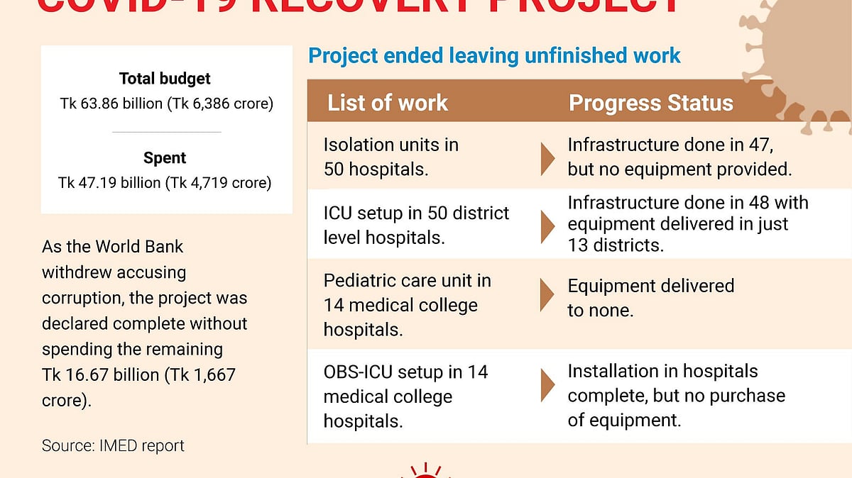 The IMED report also noted that essential medical supplies worth Tk 3 billion (Tk 30 crore) were purchased on an emergency basis under the project, but those remained unused and did not benefit the public.