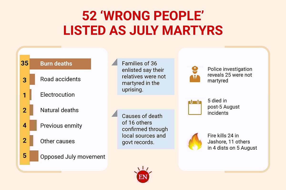 A two-month investigation revealed that among the 834 people listed in the government’s gazette, at least 52 do not actually qualify as martyrs. Among them, 35 died in fires, 3 in road accidents, 1 from electrocution, 2 from illness, 4 from killings related to old enmities, disputes, or clashes, and 2 from other causes. In addition, 3 police officers, a Chhatra League leader, and an individual who attacked protesters were also included, though none of them qualify as martyrs.