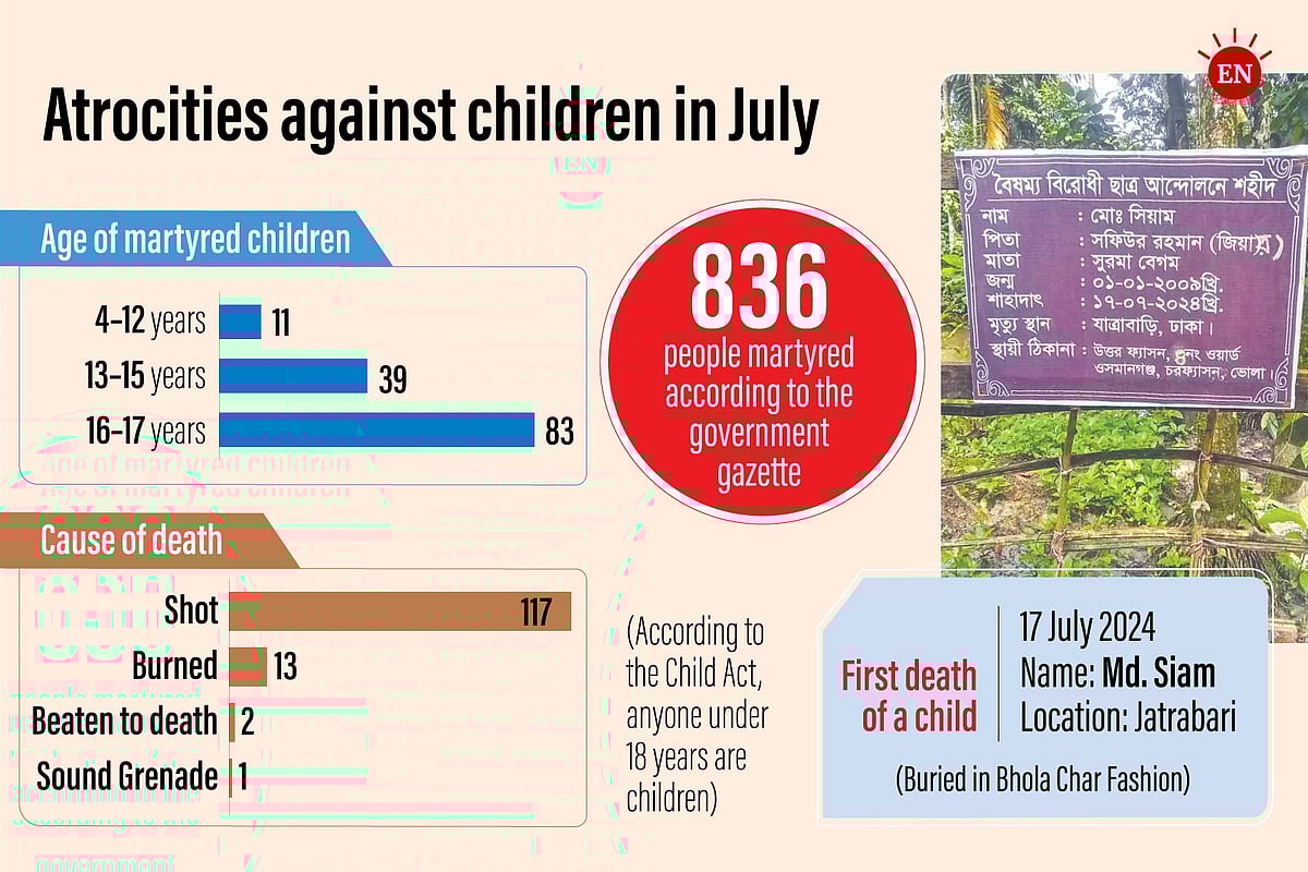 Three other children, like Ahad, were shot and killed in their own homes. They were Safqat Samir (10) in Mirpur, Naima Sultana (15) in Uttara, and Riya Gope (6) in Narayanganj.