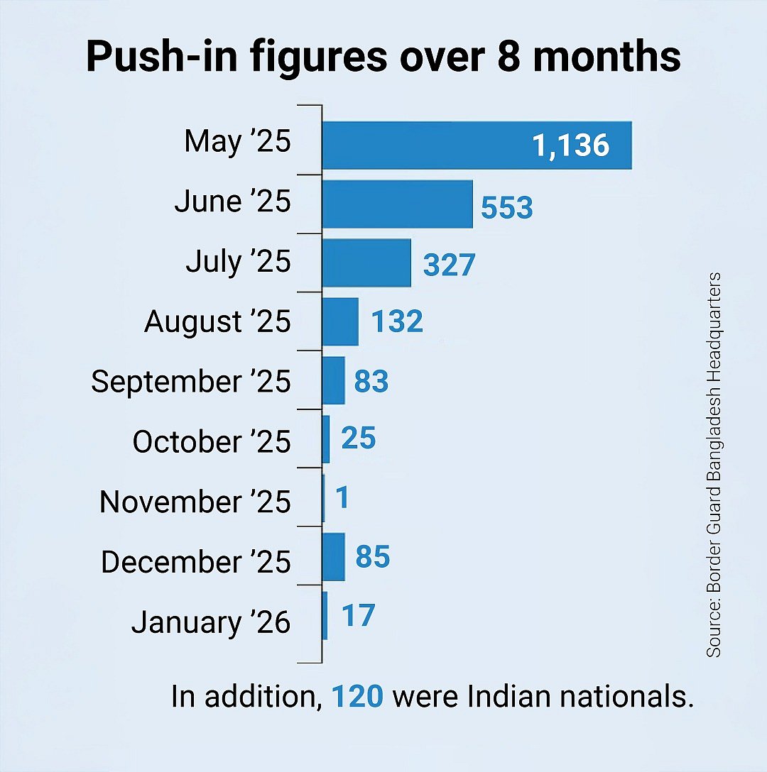 Not only in Gomastapur or Darshana, but between 7 May last year and 26 January this year—a period of eight months—the BSF pushed a total of 2,479 people into Bangladesh through border points in 32 districts across the country. Of them, 120 were identified by BGB as Indian nationals.