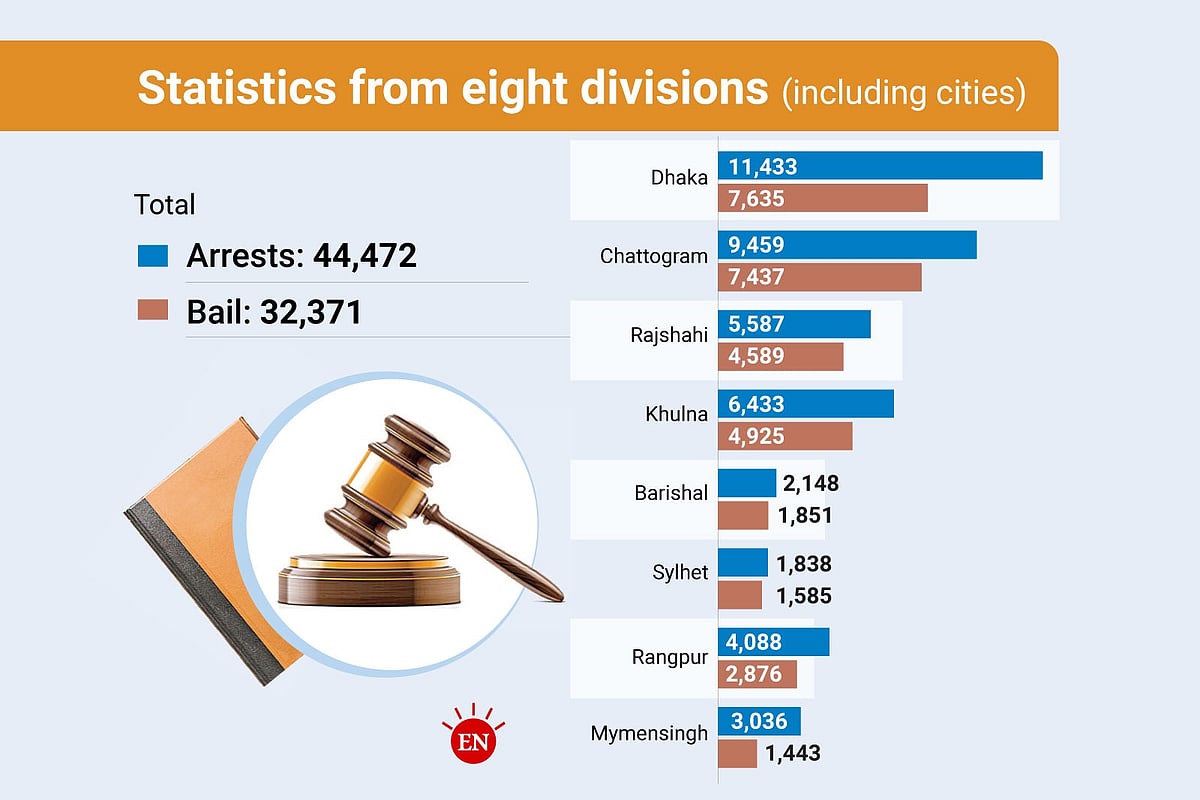 Dhaka Range: Arrested 7,355, bail 4,806 (65pc), Rajshahi Range: Arrested 5,018, bail 4,221 (84pc), Khulna Range: Arrested 5,992, bail 4,554 (76pc)