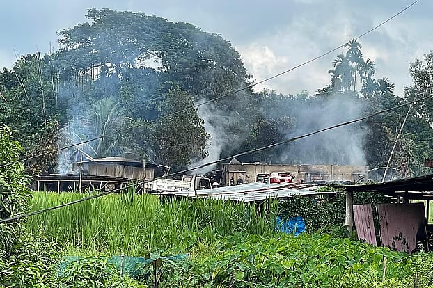 A short distance from the building stood a turmeric warehouse, which was also set on fire on Sunday. By Monday morning, the fire had not been completely extinguished. Around 9:30 am, a fire service truck was still working to douse the flames, with smoke continuing to rise.