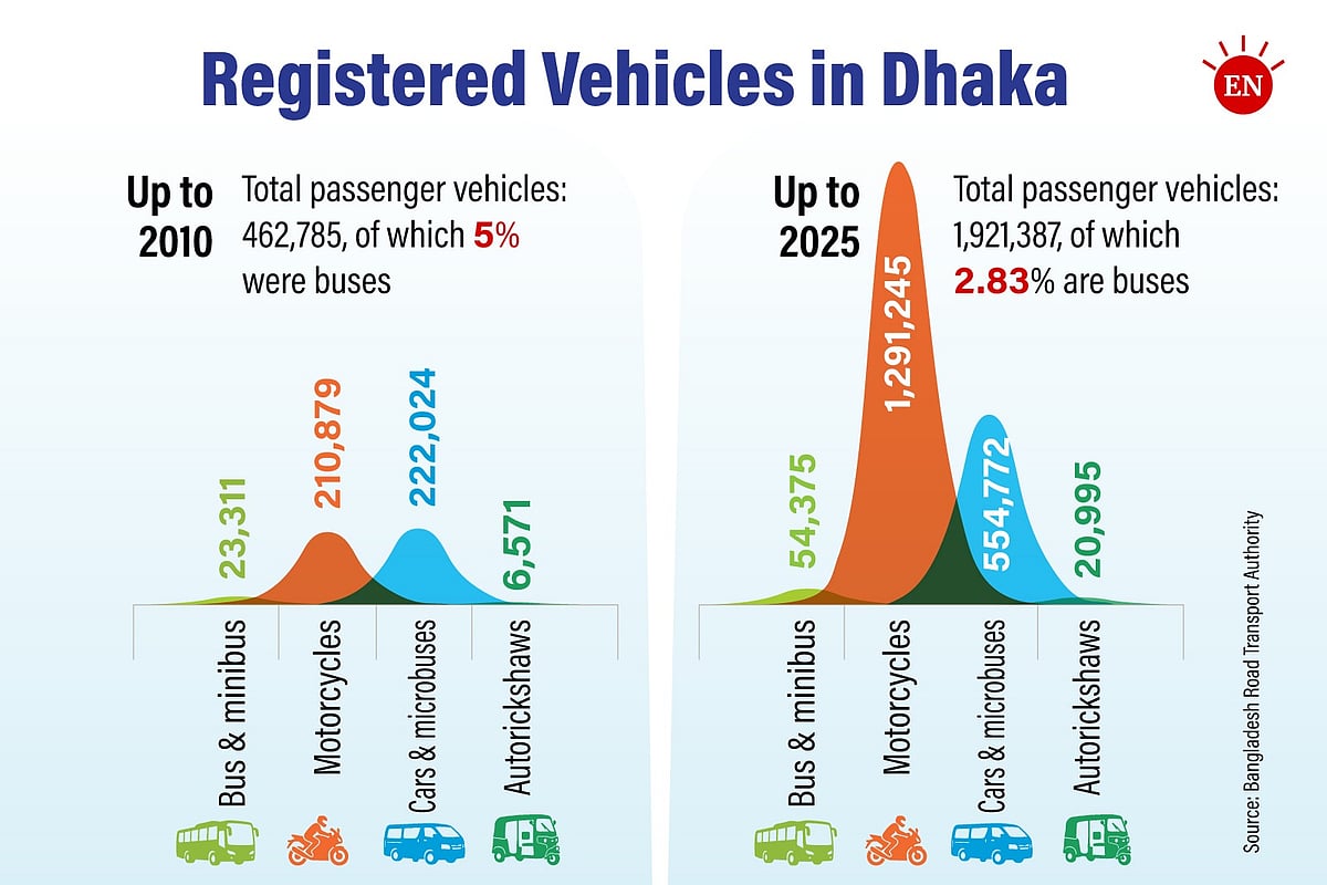 According to data from the Bangladesh Road Transport Authority (BRTA), the number of registered buses, minibuses, cars (sedans), SUVs, microbuses, autorickshaws, and motorcycles in Dhaka stood at 462,785 in 2010.