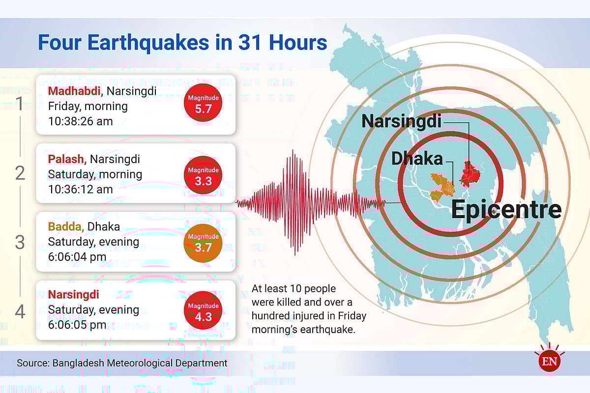 In the span of about 31 hours between Friday and Saturday, four earthquakes struck Dhaka and its surrounding areas, bringing the threat into sharper focus. Of these, Friday morning’s 5.7-magnitude quake on the Richter scale originated in Madhabdi of Narsingdi, around 25 km from Dhaka. The hypocentre was just 10 km below the surface.