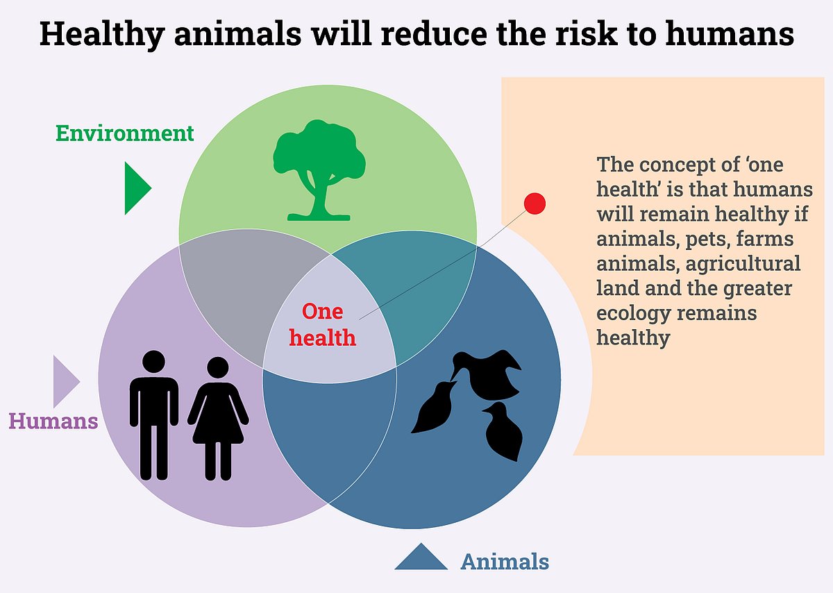 The basic concept of One Health is that people cannot maintain their health in isolation. Human health will only remain good when the health of wild animals, pets, farm animals, agricultural land and the greater environmental surroundings remains healthy too.