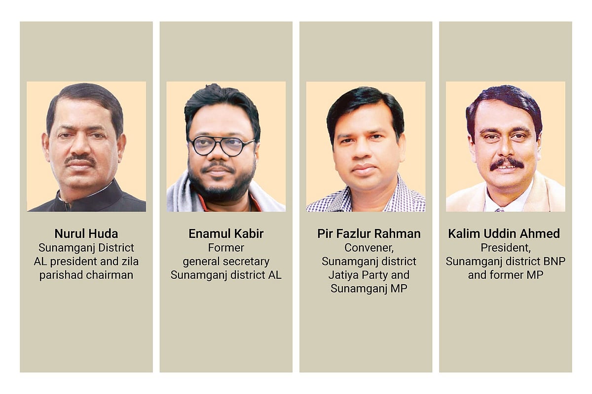 Nurul Huda, elected chairman of Sunamganj zila parishad twice consecutively, has been the AL district committee general secretary for 15 years and senior vice president for six years. His younger brother Khairul is district Jubo League convener and Sadar upazila parishad chairman.