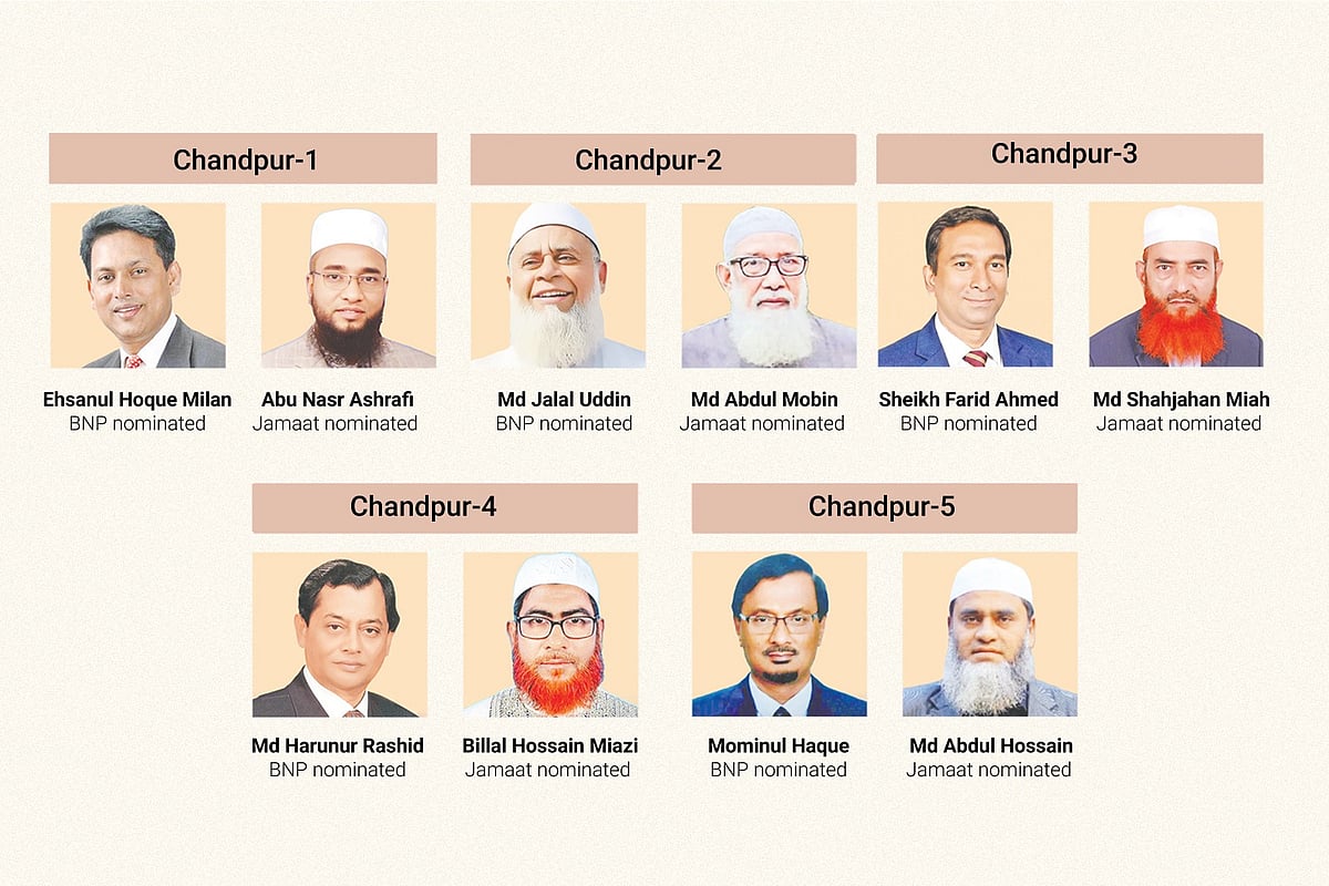 BNP has nominated Md Jalal Uddin, a member of the party’s national executive committee, for this constituency. However, a section of local leaders and activists have demanded a change of candidate. Supporters of Tanvir Huda, son of the late former MP Nurul Huda of Chandpur-2, have been protesting to demand his nomination.