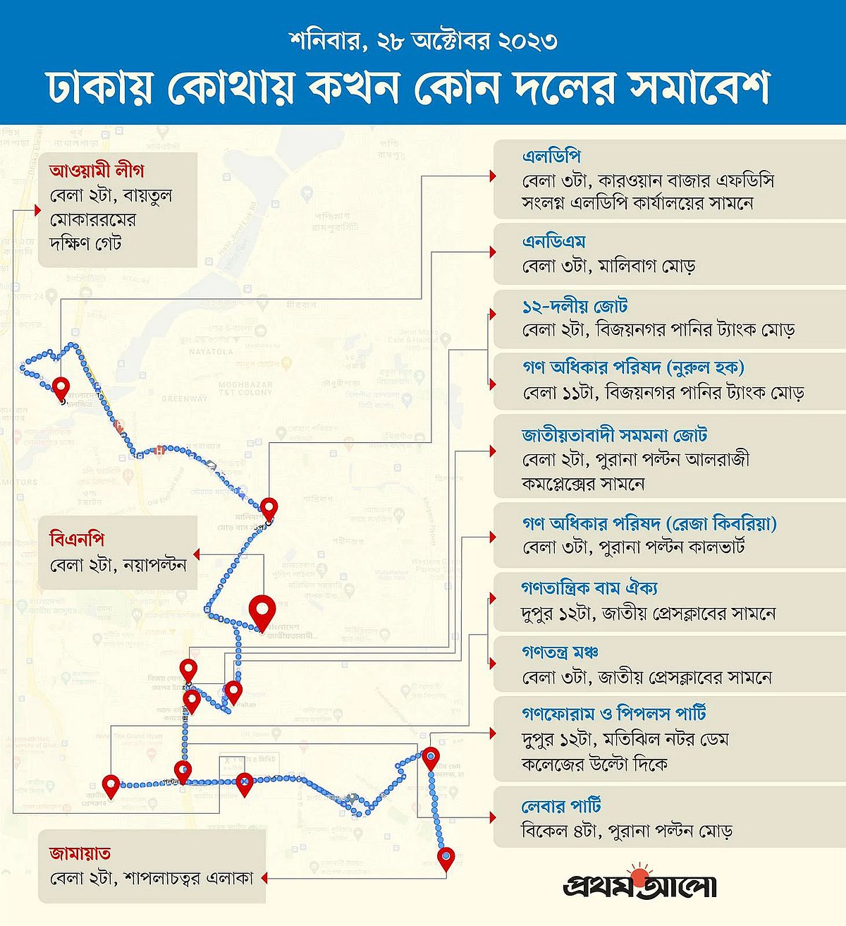 Different parties will hold rallies in different locations at different time in Dhaka today, Saturday.