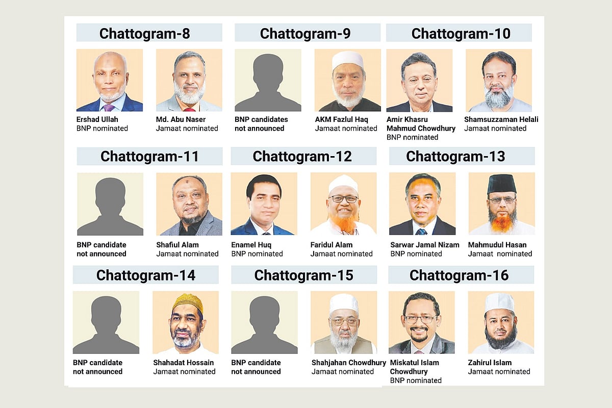 Jamaat-e-Islami has nominated Abu Naser, the naib-e-amir of Boalkhali upazila Jamaat, for the Chattogram-8 constituency. From the National Citizen Party (NCP), central joint chief organiser Zobairul Arif is expected to contest, while Islami Andolan's candidate is expected to be the party’s city assistant secretary Mohammad Nurul Alam.