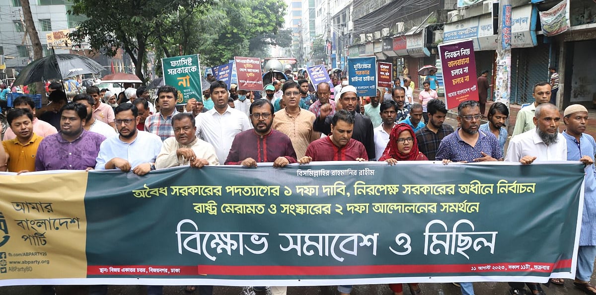 Amar Bangladesh Party, AB Party, held a protest meeting followed by a rally on Friday morning at Bijoy Ekattur square. The meeting was presided over by Anisur Rahman Kochi, joint convenor of AB Part, Mojibur Rahman Monju, member secretary and Asaduzzaman Fuaad, joint member secretary, spoke at the pre-rally meeting, said a press release.