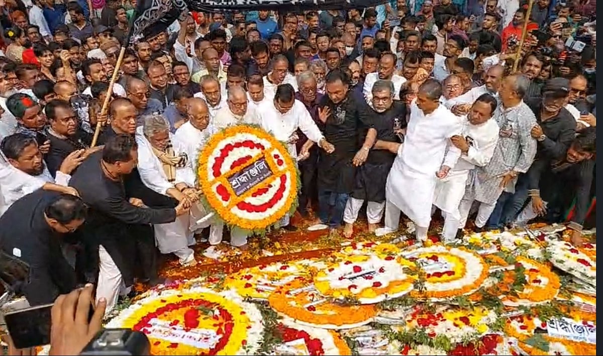Bangladesh Nationalist Party (BNP) central leaders led by its standing committee member Khandaker Mosharraf Hossain reached the Central Shaheed Minar around 12:30 pm after waiting for nearly five hours and placed a wreath at its altar.