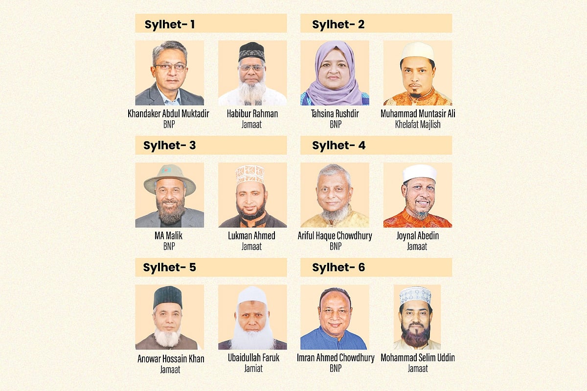 Jamaat’s long-time grassroots organiser, former Dakshin Surma Upazila chairman Lokman Ahmad, is their candidate here. Others campaigning include NCP central member Nurul Huda, Islami Andolan’s Maulana Redwanul Haque Chowdhury, Bangladesh Khelafat Majlis’s Maulana Abdul Qayyum Hajipuri, Jamiat’s Nazrul Islam, Khelafat Majlis district general secretary Dilwar Hossain, and Islami Oikya Jote’s Hafiz Maulana Moinul Islam Ashrafi.
