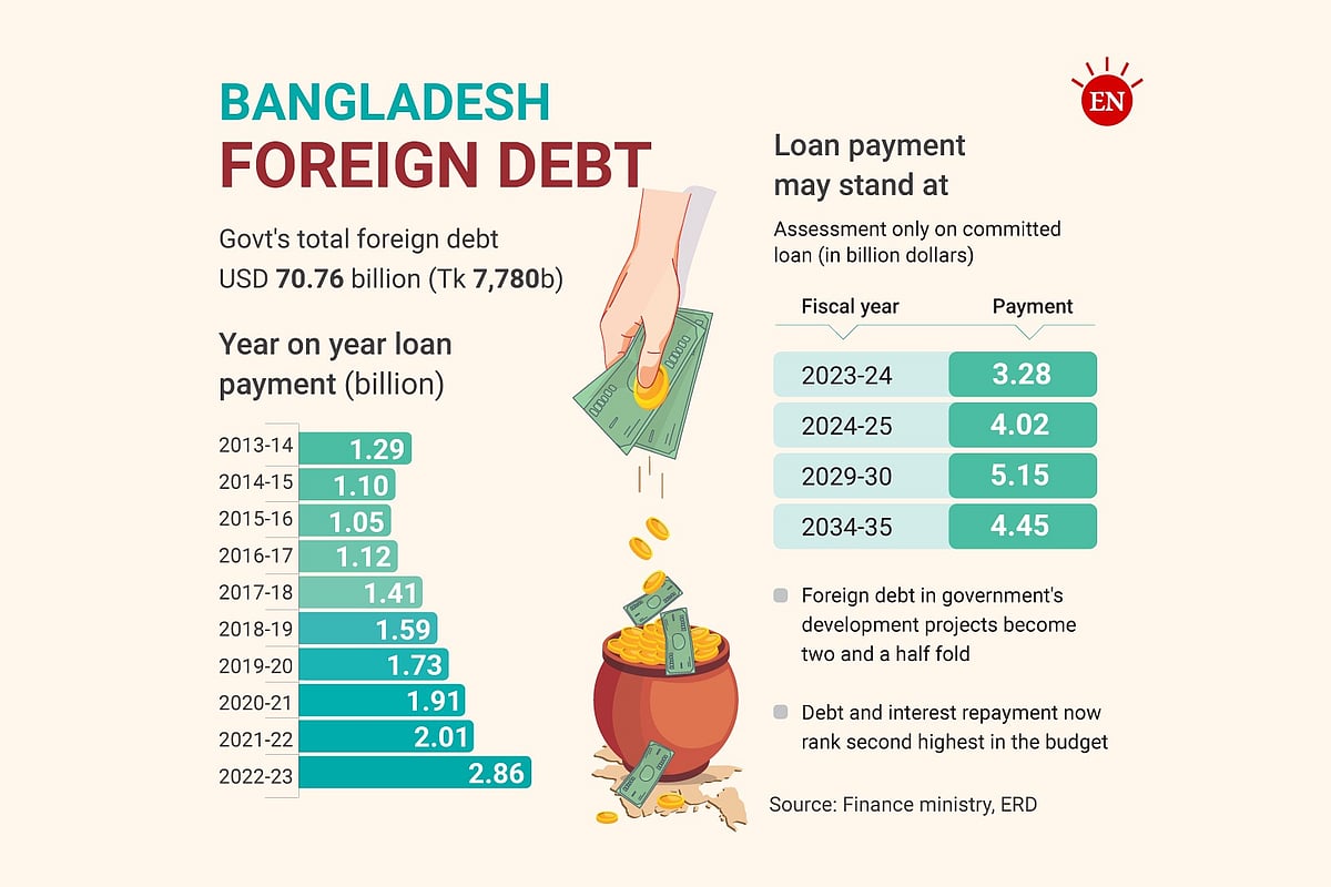 According to a recent report of the finance ministry, if the government does not take any fresh loans, Bangladesh will have to pay about double the current amount after seven years.