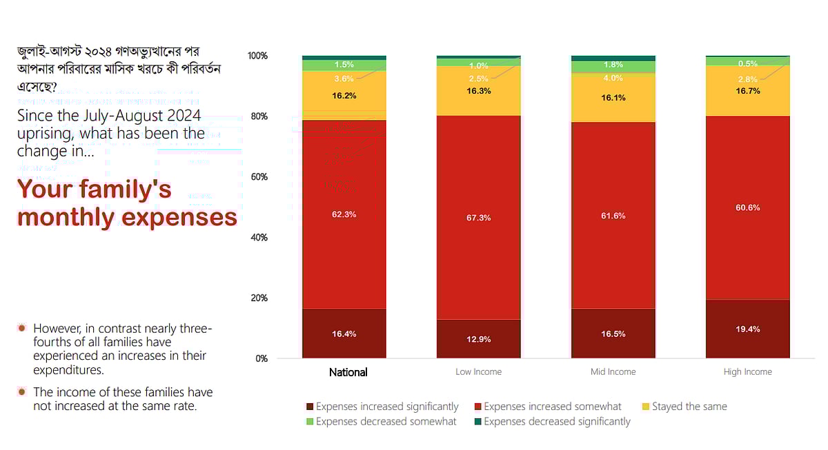 The survey also asked what change respondents had noticed in the prices of daily necessities since the July mass uprising. More than 82 per cent said prices had gone up. About 9 per cent believed prices had remained unchanged, and the remaining roughly 9 per cent said prices had fallen. People from lower-income groups more frequently reported price increases; among others, the rates were similar.