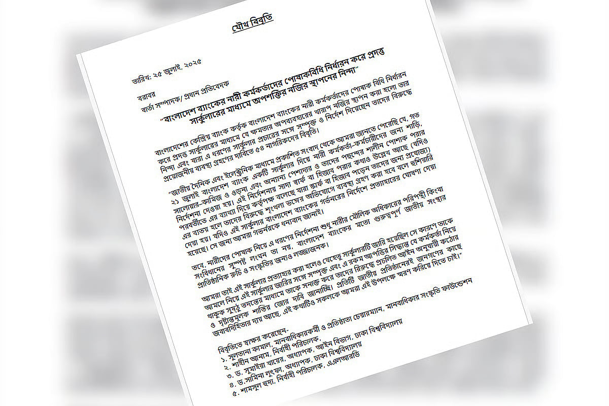 Fifty-four prominent citizens have strongly condemned the recent dress code directive issued for female officers at Bangladesh Bank, describing it as a “bad example of authority”.
