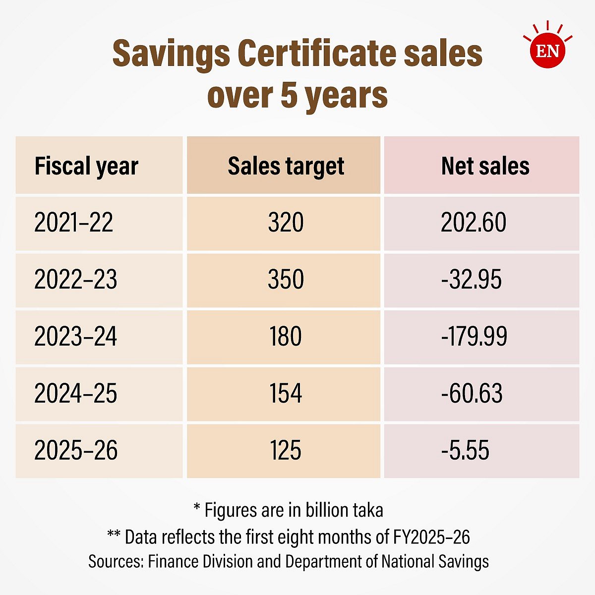 Md Abdur Rahman Khan, secretary of the Internal Resources Division, told Prothom Alo that the net sales of savings certificates have remained negative for four years because encashments have exceeded purchases.