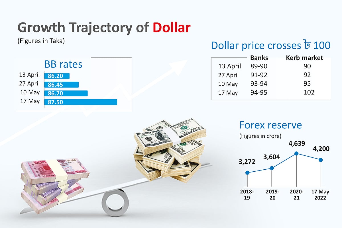 Bangladesh Bank has fixed the dollar price at Tk 87.5 but the commercial banks are charging Tk 95 for each dollar. The price crossed the Tk 100-mark at the kerb market. Each dollar was selling at Tk 102 at the open market on Tuesday.