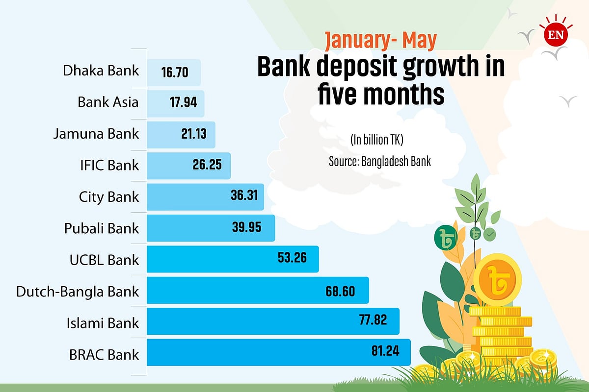 Between January and May, IFIC Bank’s deposits rose from TK 482.78 billion to TK 509.03 billion; Jamuna Bank’s deposits increased from TK 299.46 billion to TK 320.59 billion; Bank Asia’s deposits grew from TK 384.13 billion to TK 402.07 billion and Dhaka Bank’s deposits rose from TK 283.20 billion to TK 299.90 billion.