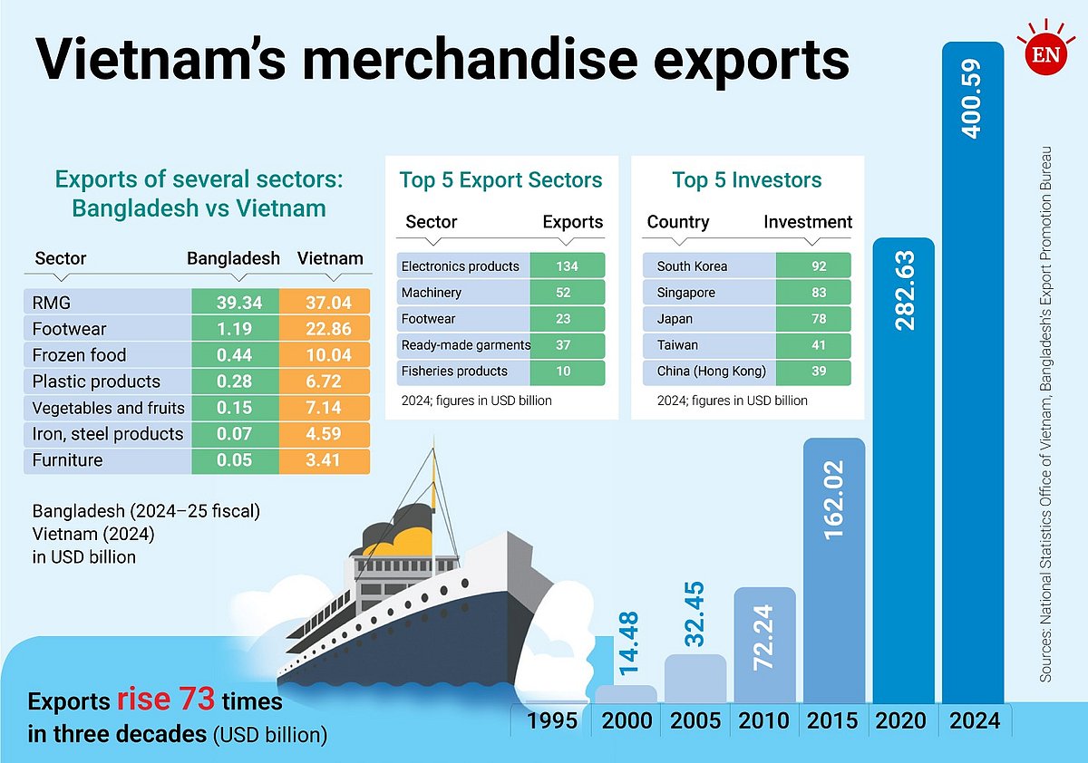 Bangladesh has many similarities with Vietnam. Both were agriculture-dependent economies. Vietnam was reunified in 1975 after a long war, while Bangladesh became independent four years earlier. In the 1990s, both countries began transforming their economies through the garment sector. However, Vietnam later attracted diversified foreign investment and advanced rapidly, while Bangladesh remained largely garment-dependent for four decades.