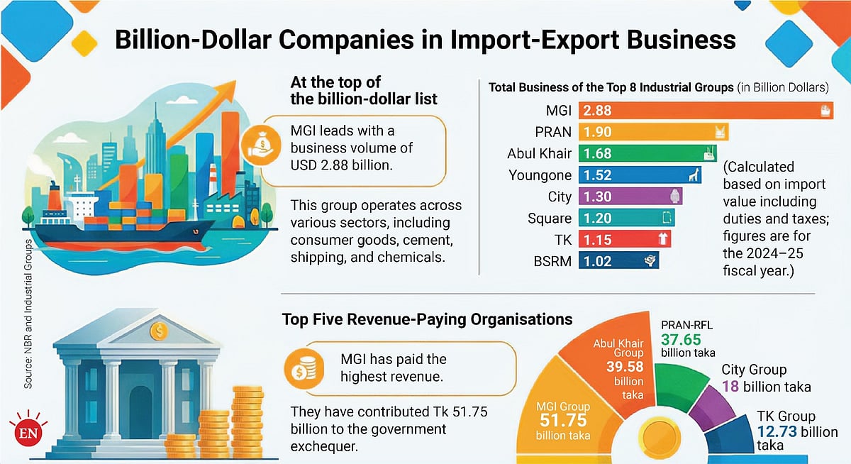 The eight industrial groups that joined the billion-dollar club are: Meghna Group of Industries (MGI), PRAN–RFL Group, Abul Khair Group, City Group, TK Group, Square Group, BSRM Group, and South Korea’s Youngone Corporation.