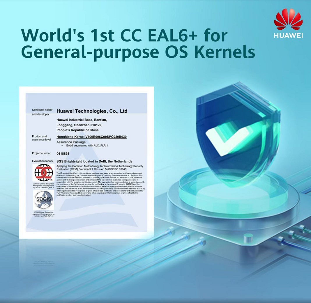 This is the highest security level available in the field of general-purpose operating system (OS) kernels. Huawei is the world's first smart device manufacturer to receive certification in this domain.