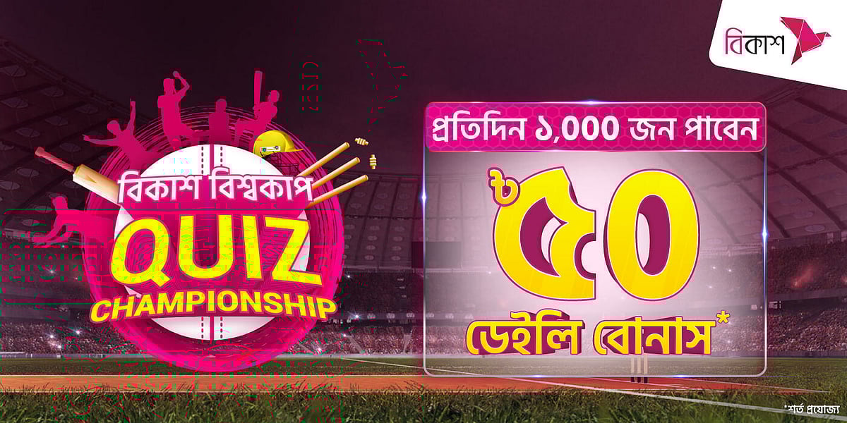 1000 winners can get Tk 50 each everyday by participating in the bKash World Cup quiz. By answering 3 simple cricket related questions in the shortest possible time and making a transaction through bKash app one can win the prize. The quiz competition will continue till 25 October, 2023.