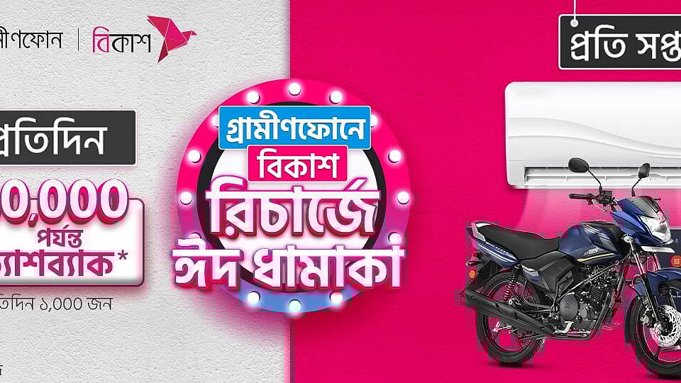 Three highest recharging customers can win Motorbike, AC and Television every week by recharging maximum amount to any Grameenphone number through bKash. On top of that, 1,000 customers are getting up to Tk 10,000 cashback everyday by recharging highest amount to Grameenphone number using bKash, said a press release.