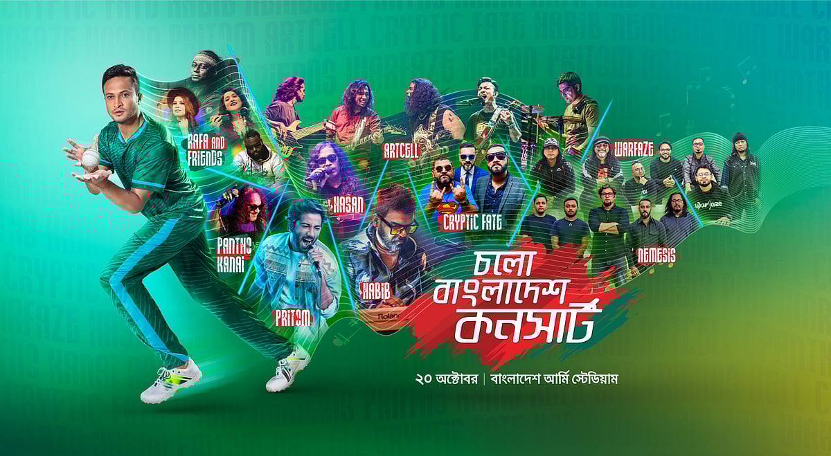 The Cholo Bangladesh Concert will feature a star-studded array of artists, including Artcell, Cryptic Fate, Habib Wahid, Nemesis, Pritom Hasan, Rafa and friends, Pantho Kanai, Hasan, Warfaze and many more.