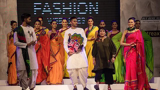 Towards the end some models were "gagged" with decorated fabrics of the same colour as the shari or the blouse. These weren’t masks. These were symbols of silencing.
