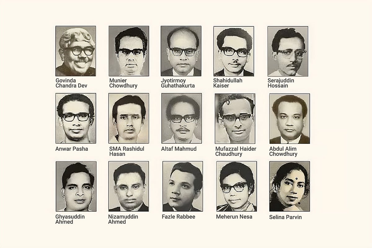 14 December is Martyred Intellectuals Day. In the final days of Bangladesh’s War of Independence in 1971, realising that defeat was inevitable, the Pakistani occupation forces—assisted by their collaborators Al-Badr and Al-Shams—systematically abducted large numbers of teachers, writers, doctors, journalists, engineers, cultural activists, and other professionals from residential areas of Dhaka University as well as from different parts of the country, and brutally killed them. Numerous killing fields across the country, including those at Rayerbazar and Mirpur, stand as “living witnesses” in the history of the Liberation War to these atrocities against intellectuals.