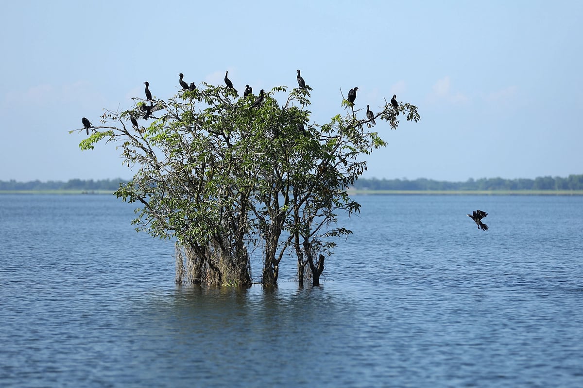 A boat drifts in full sail through the water of Dharla river. Photo taken from Jatrapur area in Kurigram on 16 September.Against the soft rising sun, a farmer takes his cows to the field to plough a patch of land. Photo taken from Shingerdabri area in Razarhatt upazila of Kurigram on 16 September. Water has turned bluish in Hakaluki Haor, the largest haor in Bangladesh. A flock of little cormorant locally known as Pankouri rest on a half-immersed Indian Beech (Karach) tree in search of food. Photo taken in Hakaluki Haor from Ghilachara area in Fenchuganj, Sylhet on 15 September.