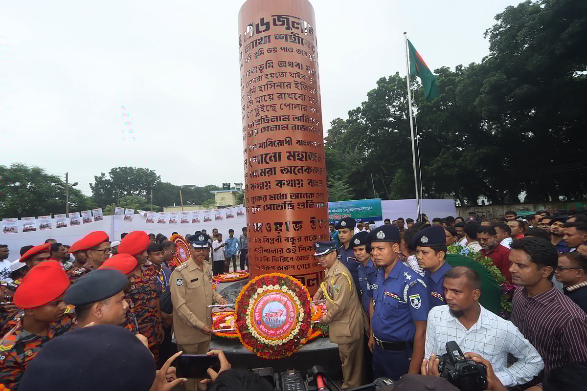 Artistes performing at the July Reawakening program organised to celebrate the July Mass Uprising Day on the Manik Mia Avenue, Dhaka, 5 August. Professor Asif Nazrul, Adviser to the Ministry of Law, Justice, and Parliamentary Affairs, speaking at the release event for Prothom Alo’s documentary titled ‘Bloody Highway: The Jatrabari Massacre,’ at Prothom Alo office in Kawran Bazar, Dhaka, 5 August. Retired armed forces personnel and members of the student-public alliance participating in a march in the Shahbagh, Dhaka, 5 August. Local administrations, social, civic, and cultural organisations pay tributes at the newly built July Martyrs’ Memorial in New Engineer Para, Rangpur on 5 August on the occasion of the July Mass Uprising Day.More than a hundred cyclists participated in a cycle rally organised by Volunteer for Bangladesh and the Khulna Cycling Committee in celebration of July Mass Uprising Day. Shibbari Mor, Khulna, 5 August. People from various walks of life gathered after the inauguration of the July Martyrs’ Memorial in the C&B Mor Area in Rajshahi, 5 July.