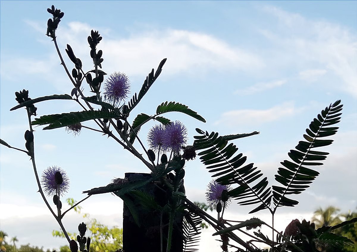 Sensitive plant bloom on the roadside. Majerhati road, Moulvibazar. 3 SeptemberA colouful grasshopper has flown and landed upon a green vine. Batiaghata, Khulna, 3 September.