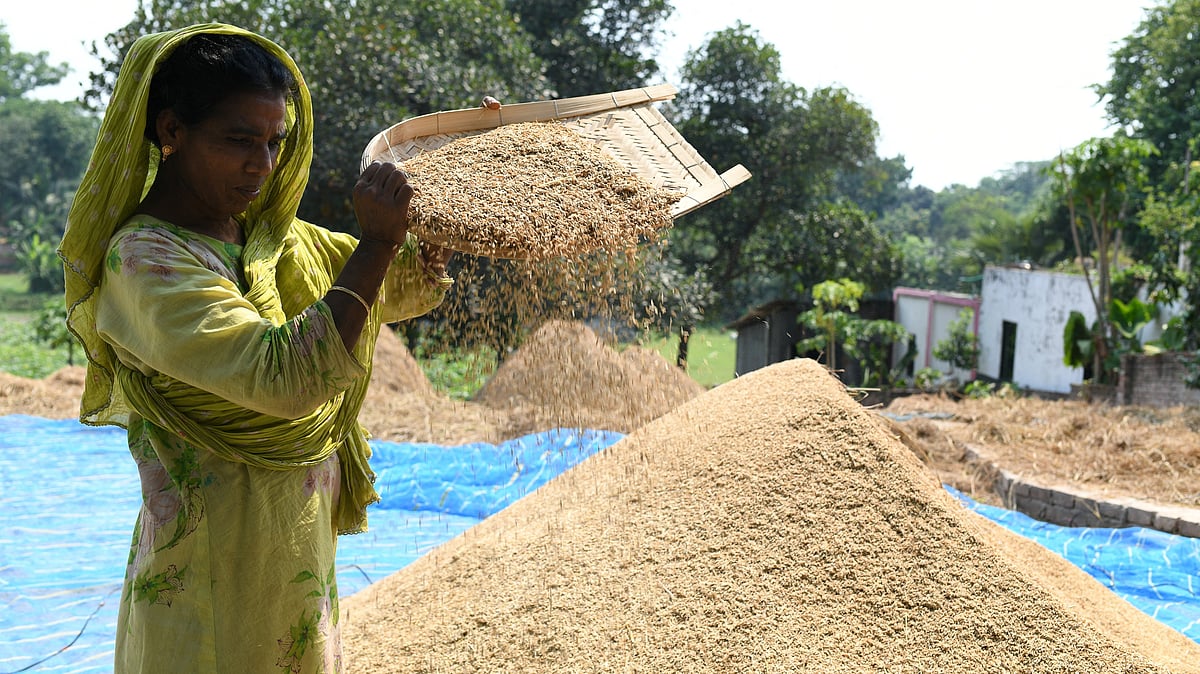A worker piles up paddy after separating them from the sheaf by a machine in Birulia, in the outskirts of Dhaka, Bangladesh on 8 May, 2023A woman dries paddy as a part of the harvesting process in Birulia, in the outskirts of Dhaka, Bangladesh on 8 May, 2023A worker piles up paddy after separating them from the sheaf, in Birulia, in the outskirts of Dhaka, Bangladesh on 8 May, 2023A woman sun-dries paddy as a part of the harvesting process, in Birulia, in the outskirts of Dhaka, Bangladesh on 8 May, 2023Farmers pour paddy into sacks after sun-drying, in Birulia, in the outskirts of Dhaka, Bangladesh on 8 May, 2023