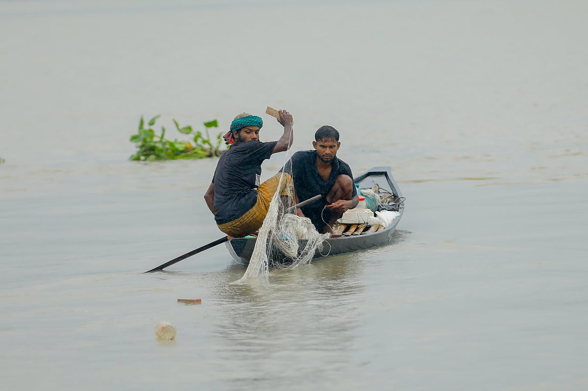 Two fishermen cast their net from a small boat in the Bhairab River. Photo taken near Ghat (landing station) no. 5 in Khulna on 1 August 2025.