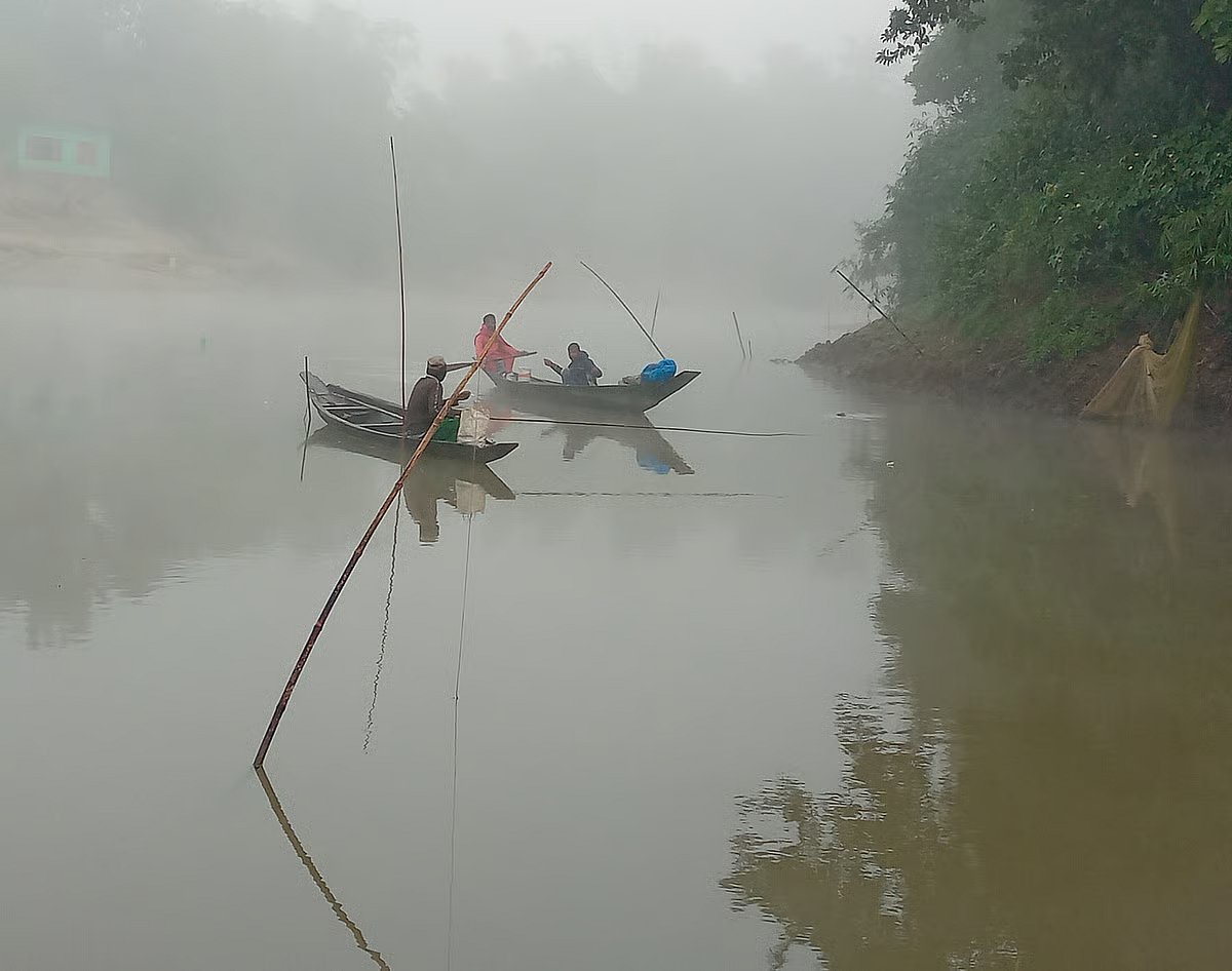 Water levels in the Juri River have dropped. On a foggy morning, fishermen sit still on boats in the middle of the river, engrossed in fishing with rods. Photo taken from Ranimora area in Moulvibazar, 4 December 2025.