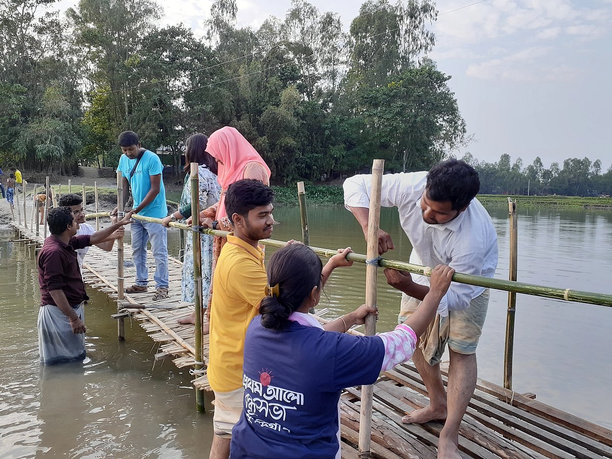 Bondhushava members paint a speed breaker on MR College Road, Dokrapara, Panchagarh. Members of Bondhushava organise a musical on free traffic jam campaign on Public Library ground in Rangpur. Bondhushava members arrange the installation of a tube well in Gormohasthan Purbapara, Shibganj, Bogura. Bondhushava members distribute leaflets on noise pollution prevention at the Alupotti intersection in Rajshahi. Bondhushava members build a bamboo bridge in Prothom Alo island in Kurigram.
