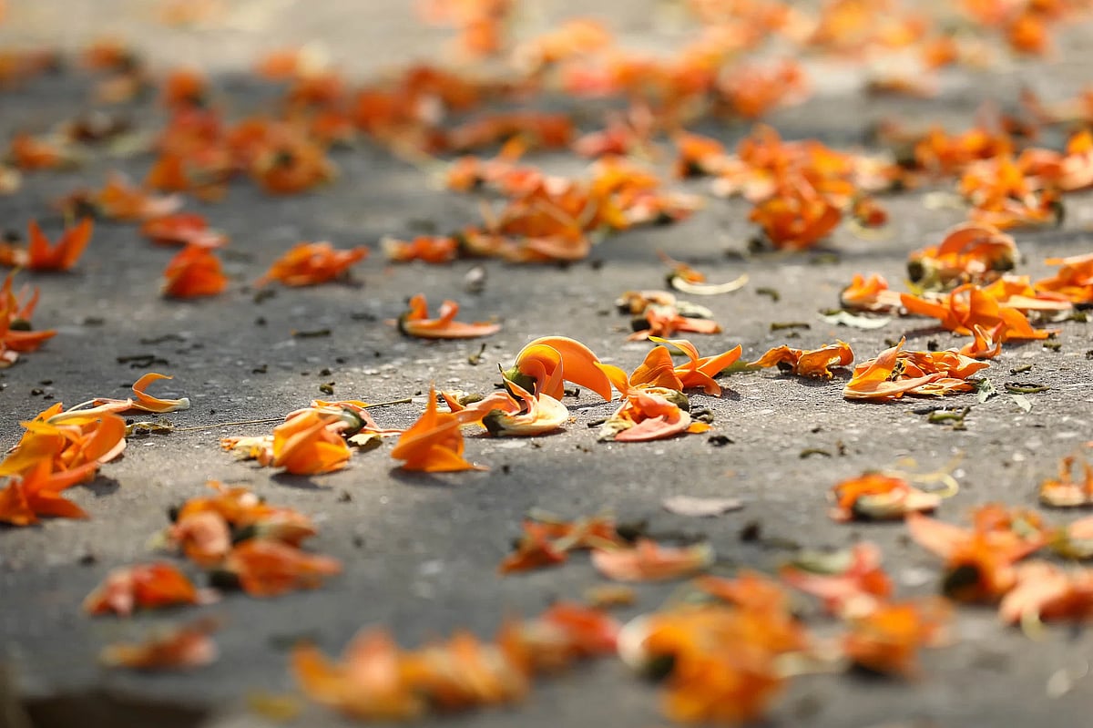 After plowing one piece of farmland the farmer walks towards another plot carrying his plow on his shoulder. The photo was taken from Rajballav area in Gangachara, Rangpur on 11 March. Orange cotton-silk flowers are strewn across the soil. The photo was taken from Shahi Eidgah area in Sylhet on 11 March. Labourers put paddy to dry on a terrace. The photo was taken from Shahebganj area in Rangpur on 12 March.