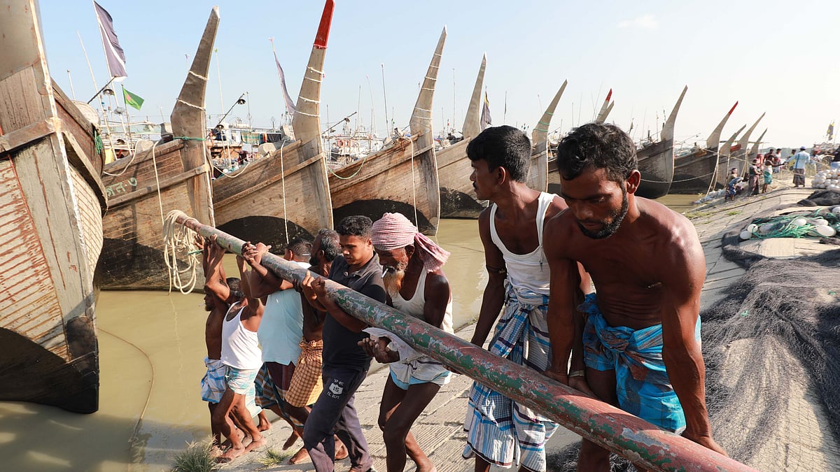 A child swims in Bhairab river. The picture was taken from ghat No 5 in Khulna on 28 October An elderly casts a net to the Padma river to fish. The picture was taken from Doghaci in Pabna on 28 October. Fishermen take all-out preparations to move towards the sea as the 22-day ban on hilsa ends today. The picture was taken from Fishari Ghat in Chattogram on 28 October.