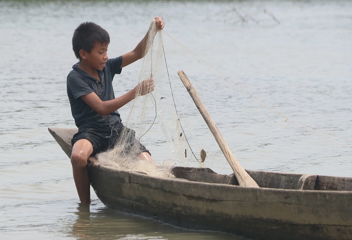 A woman returns home from the Haor, carrying a bundle of hay. Photo taken from Burdeo area in Sylhet’s Companiganj on 15 November in 2023. A child sitting on the edge of a boat collects puti and chapila fish caught in his net. Photo taken from Kaptai Lake in Katachhari of Rangamati on 15 November in 2023.