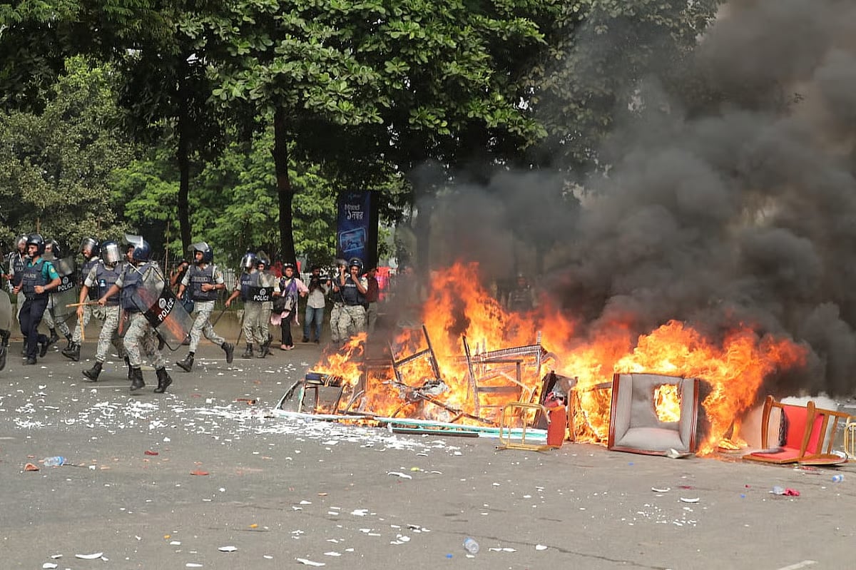 Police beating protesters on the road inside the Sangsad Bhaban complex. A police vehicle was vandalised during the clashes. Clashes between two sides on Manik Mia Avenue. Chairs and other items set aflame on Manik Mia Avenue. Flames blaze fiercely on Manik Mia Avenue. The clashes spread as far as Asad Gate area. Police push a group of protesters toward the Asad Gate end of the road. Another group of protesters was pushed toward Dhanmondi 27 area. Army personnel stationed at Asad Gate intersection.