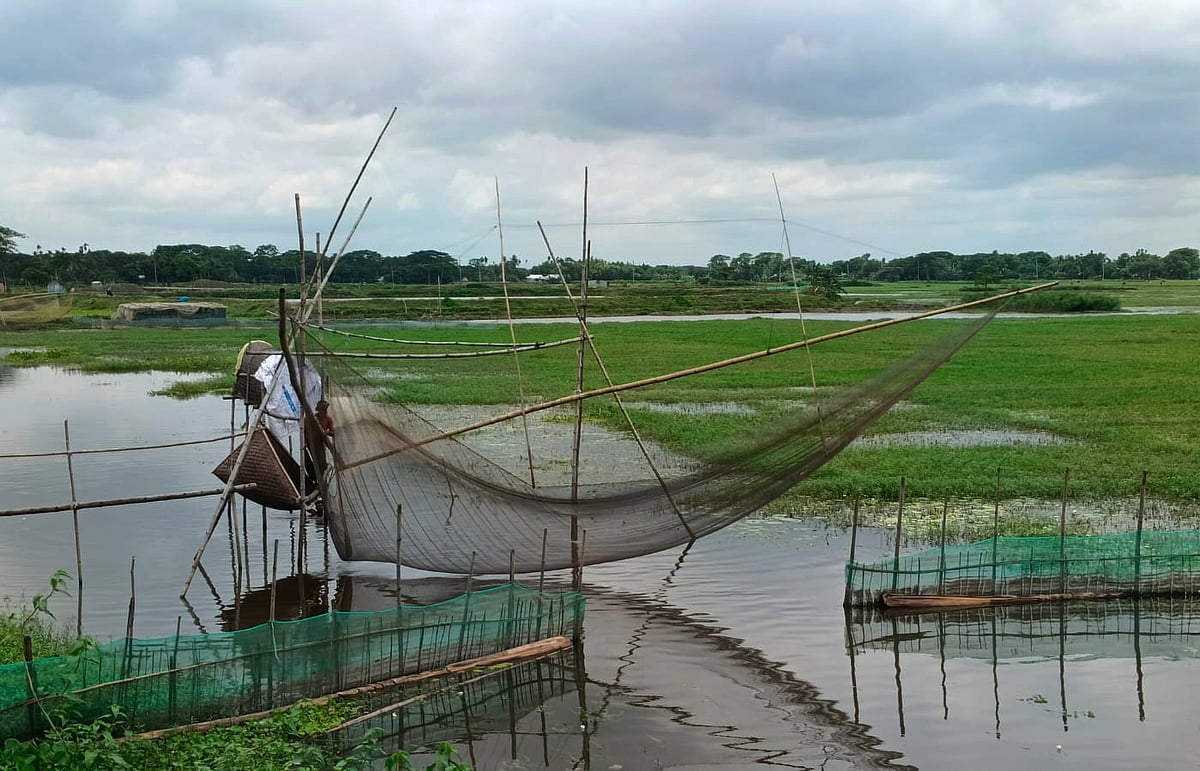 Chargowali Khandakar Nazir Ahmed High School assistant head teacher Bulbul Ahmed is spraying pesticide in his papaya garden. The photo was taken from Boro Gowali, Daudkandi, Cumilla, 5 July.Fishing continues in the flooded fields during the monsoon. The photo was taken from Kotiyapuri Beel, Gouripur, Mymensingh, 5 July.
