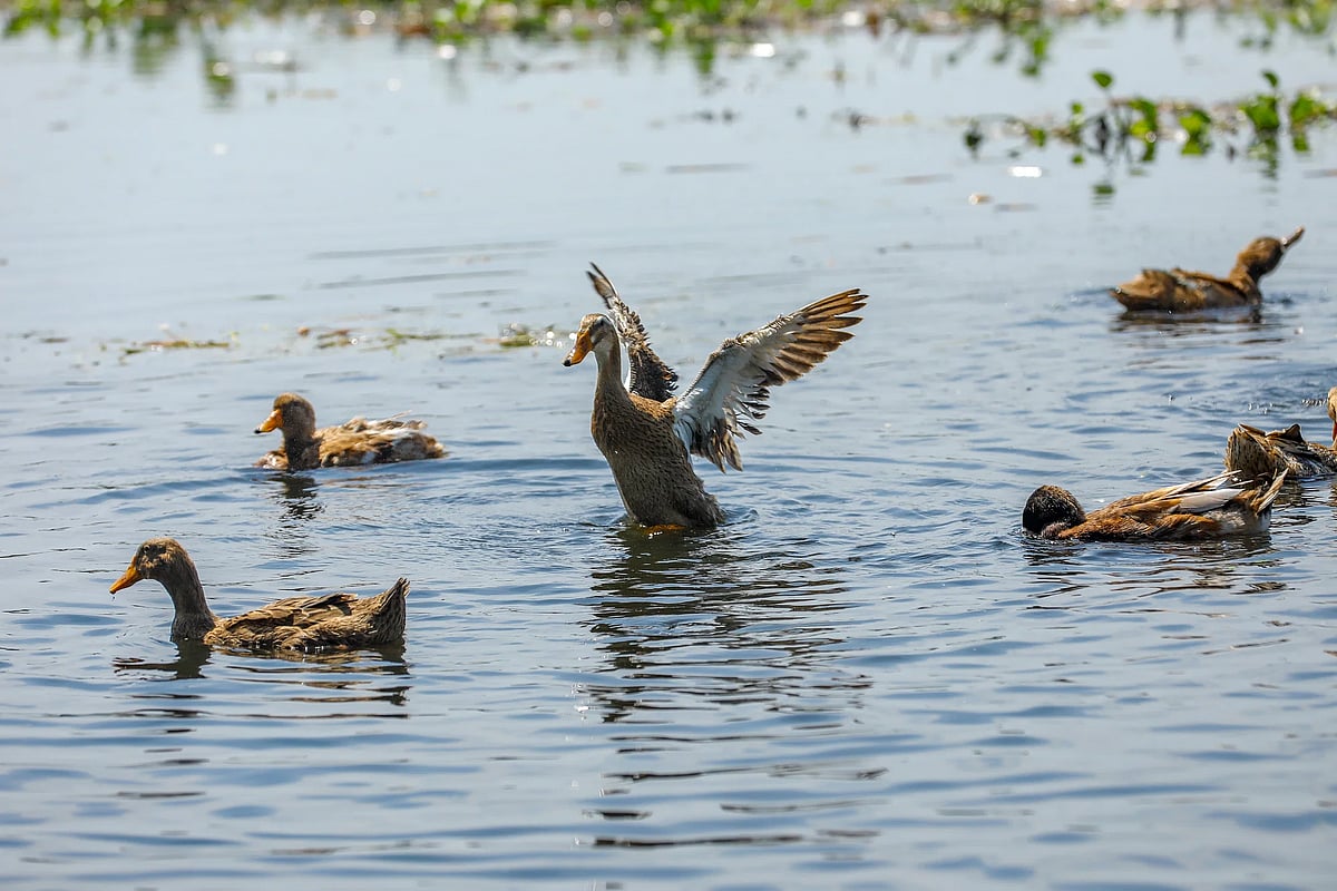 Standing in waist-deep water, a man washes the fibers separated from retted jute stalks. Photo taken from Bhutiar Beel in Terokhada area of Khulna on 23 September.Ducks swim enchantingly in the water of a lake (beel). Photo taken from Bhutiar Beel in Khulna’s Terokhada on 23 September.
