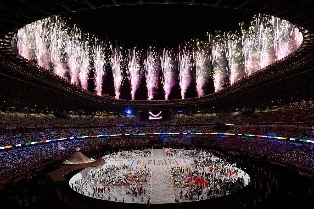 ireworks light up the sky over the Olympic Stadium during the opening ceremony of the Tokyo 2020 Olympic Games, in Tokyo