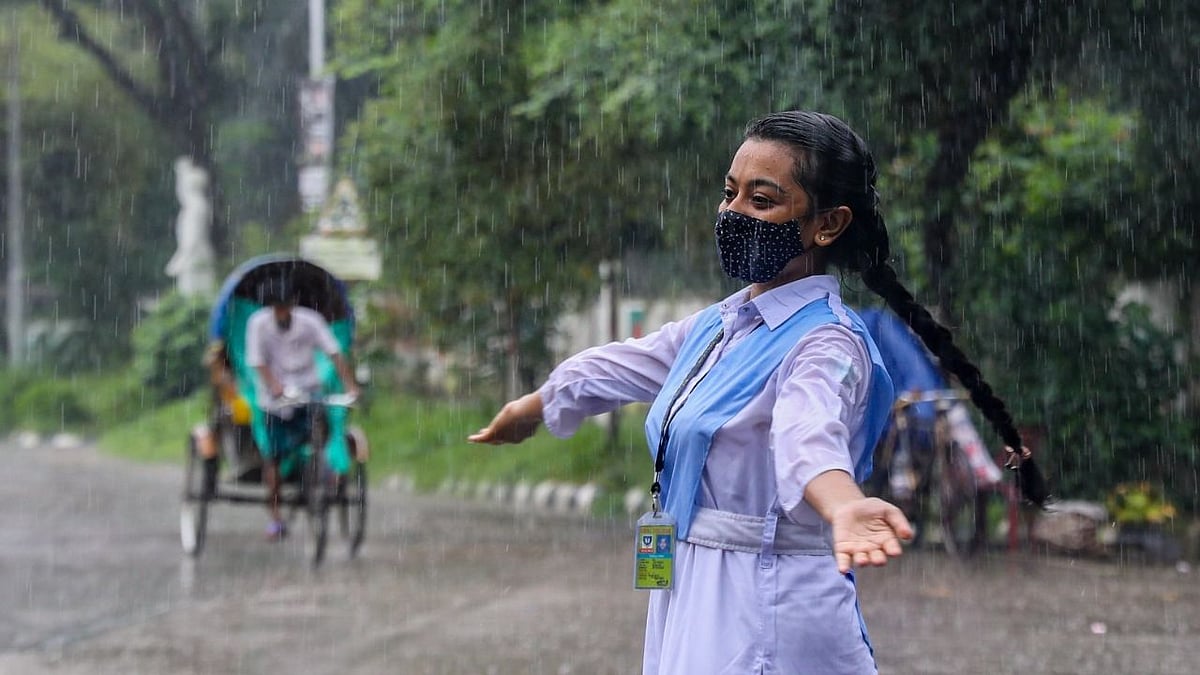 A teacher examines the temperature of students before entering the school. The picture was taken from Subal Aftab High School in Cumilla on 14 September.