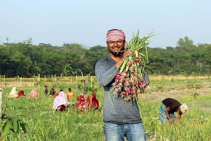 Bumper yield of onion delights farmers in Bhola sadar upazila's Rajapur union. This picture is taken on Saturday