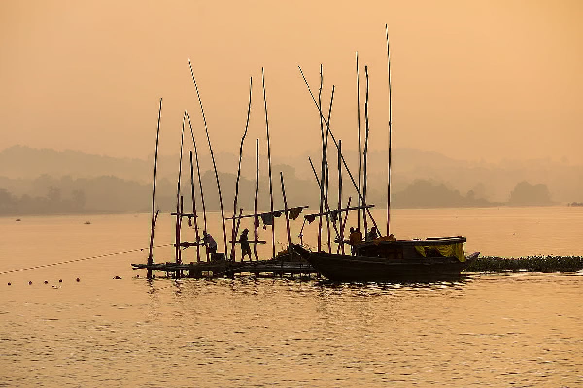 Fishermen cast their nets in the gentle light of the setting sun.A fisherman signals another boat by waving a piece of red cloth.